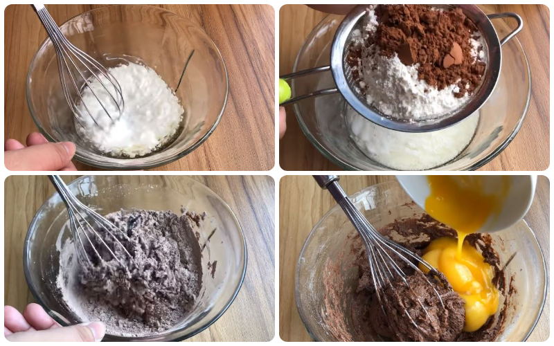 Bước 1: Rây bột: Rây hỗn hợp bột ca cao và bột mì. Để bánh được ngon nhất thì bước rây bột phải thật được mịn.