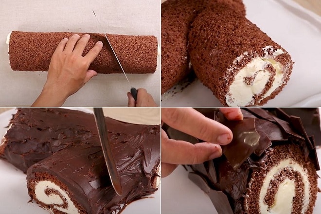- Dùng màng bọc thực phẩm cuộn bánh thật chặt tay. Như vậy, bạn đã hoàn thành chiếc bánh hình khúc gỗ rồi đó.