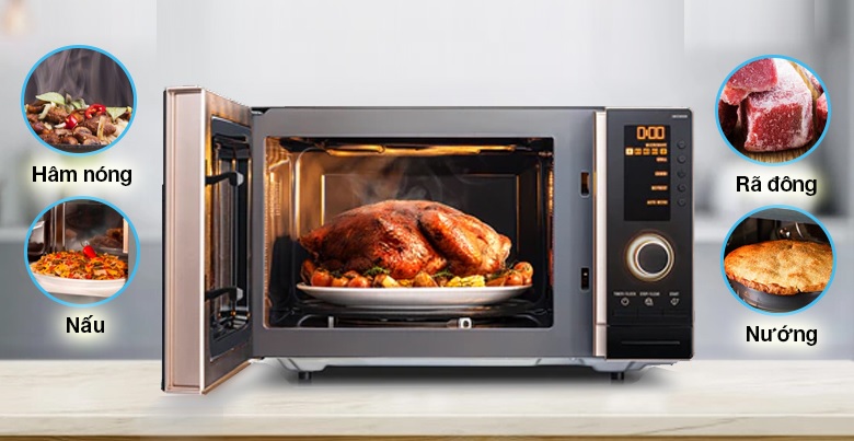 - Mặc dù chức năng chính là hâm nóng, rã đông và nấu, lò vi sóng làm chín thức ăn bằng nhiệt từ giàn nướng giúp thực phẩm chín đều đều.