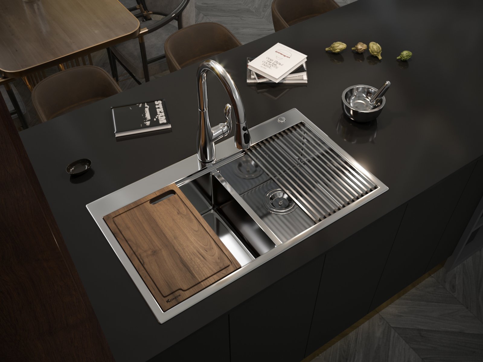 - Bát rác: với thói quen thực phẩm người Việt sử dụng của yếu là tinh bột, chất xơ; chưa phổ biến sử dụng máy rửa bát, do đó bát rác nhấn phương Tây không phải là lựa chọn phù hợp. Bát rác sử dụng trong bồn rửa chén Konox được phát triển theo thói quen sử dụng của người tiêu dùng Việt. Màng lọc bọc thép và nắp đậy chắn rác cùng bề mặt phủ lớp Nano Ag+ với công nghệ kháng khuẩn HYPERKILA-MIC ức chế hiệu quả sinh trưởng của vi khuẩn, giảm tối đa khả năng phân hủy và phát tán mùi.