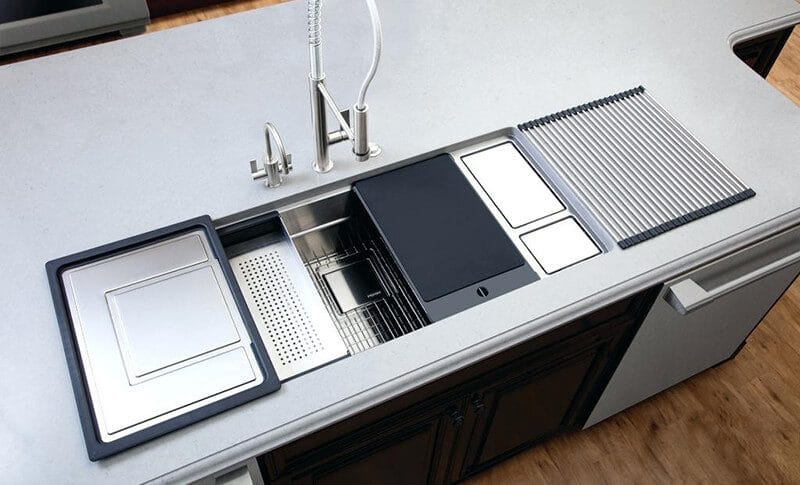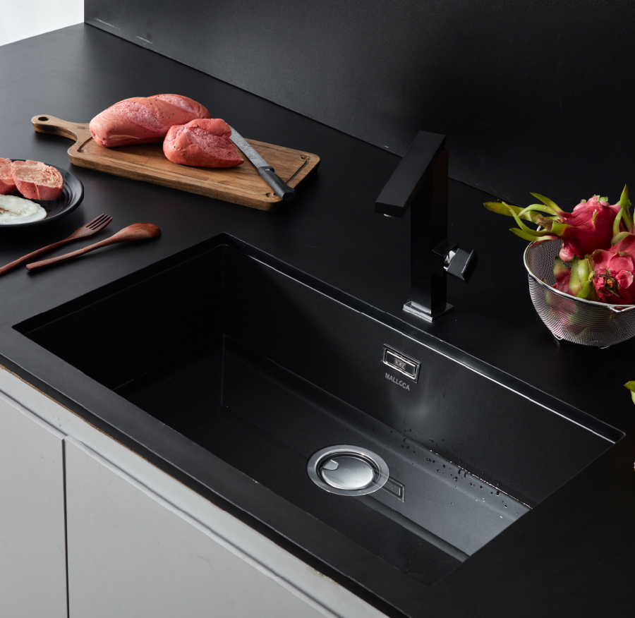 - Đa dạng mẫu mã, kích thước, thiết kế. bồn rửa chén inox đúc liền khối có các thiết kế hạ bậc, tích hợp phụ kiện: thớt gỗ, rollmat, colander hỗ trợ đắc lực cho mọi thao tác làm bếp